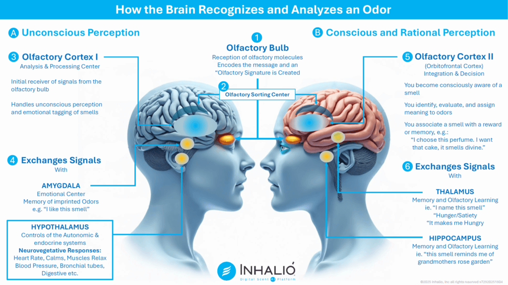 The olfactory system is uniquely powerful in the way it processes scent through both unconscious perception and conscious, rational evaluation. When odor molecules enter the nose, they bind to receptors and are transmitted directly to the olfactory bulb, where they are encoded into what can be described as an “olfactory signature.” This signal is first relayed to the Olfactory Cortex I (including the piriform cortex and amygdala), triggering unconscious perception and immediate emotional responses without cognitive awareness. These responses are deeply tied to instinct and memory. Meanwhile, Olfactory Cortex II—located in the orbitofrontal cortex—handles conscious perception, where the brain identifies, labels, and assigns value or preference to smells, linking them to experiences, choices, and desires